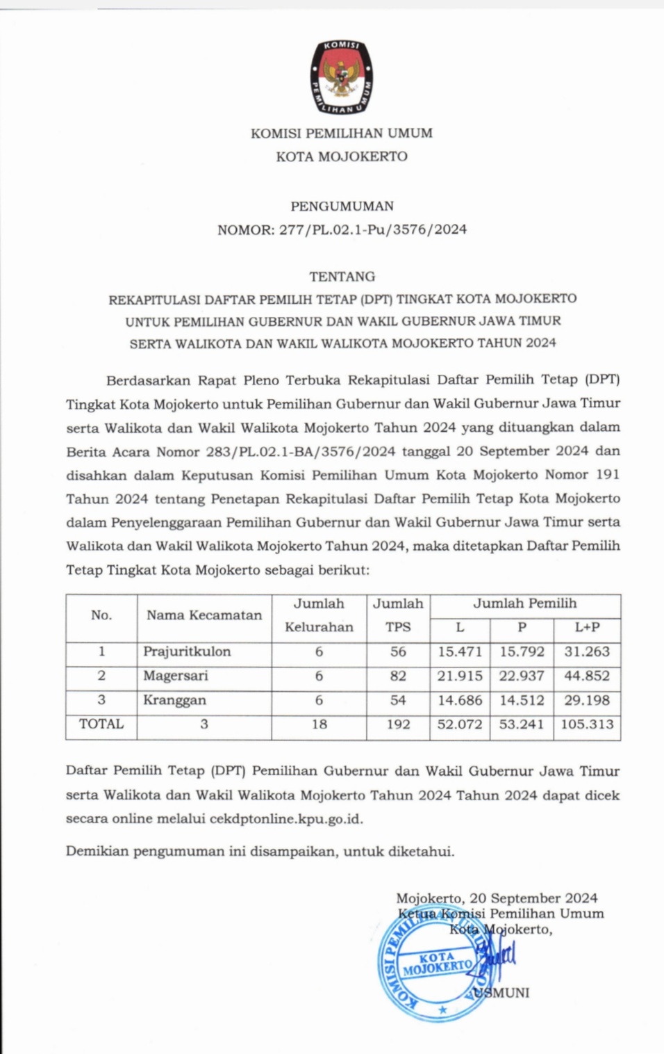 Tagarterkini.com, Mojokerto — Sebanyak 105.313 pemilih tetap telah ditetapkan oleh Komisi Pemilihan Umum (KPU) Kota Mojokerto pada Pilkada 2024. Jumlah itu tersebar di tiga kecamatan di 18 Kelurahan.