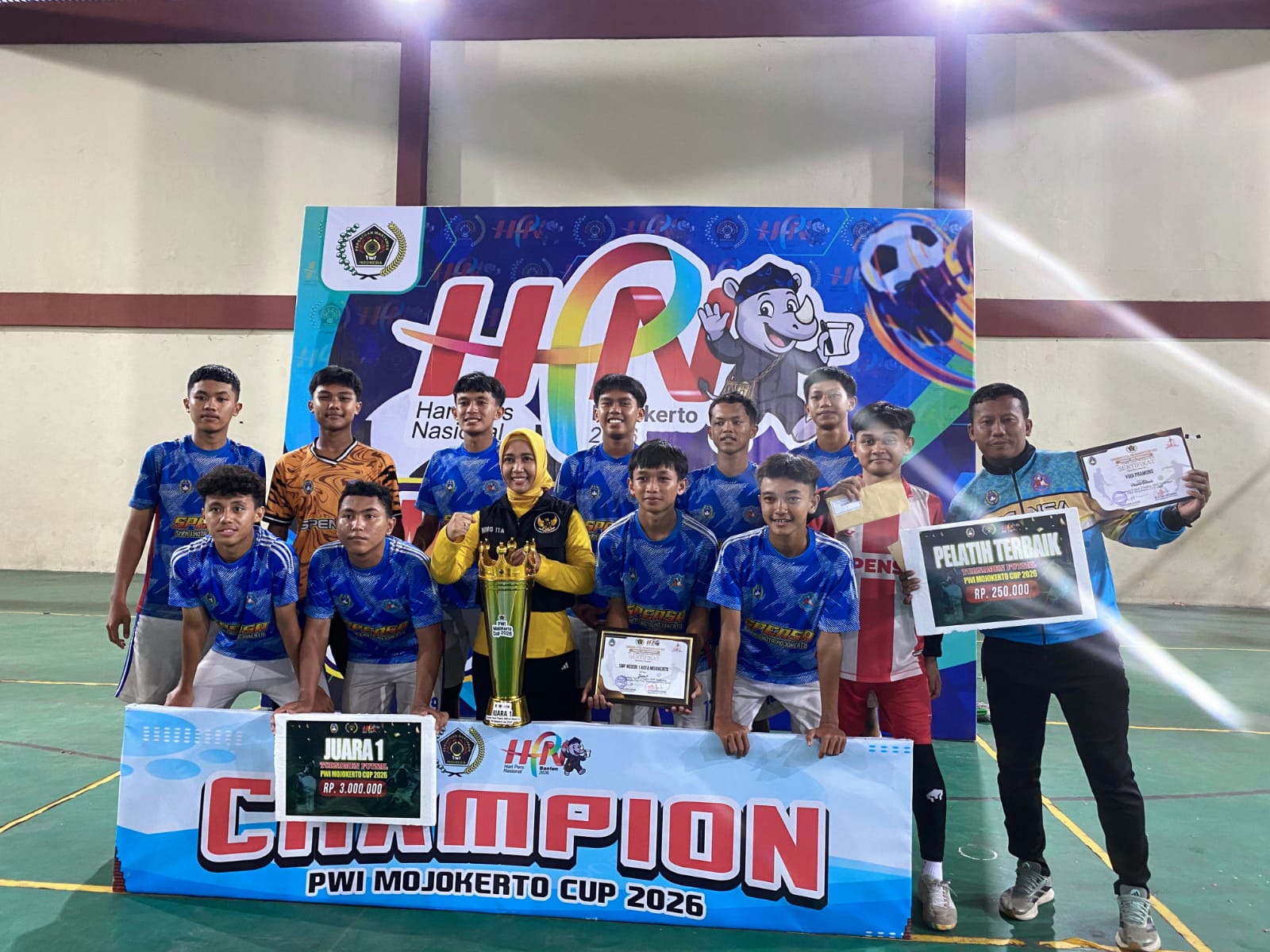 Tagarterkini.com, MOJOKERTO — SMPN 1 Kota Mojokerto berhasil keluar sebagai juara Turnamen Futsal Pelajar Piala PWI Mojokerto Cup 2026 setelah menaklukkan SMPN 9 Kota Mojokerto dengan skor 3–1 pada partai final yang digelar di GOR Seni Majapahit, Kota Mojokerto, Jumat (23/1/2026).