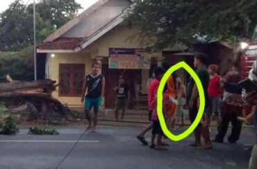 Terdapat 2 foto pada postingan tersebut. Foto pertama tampak sejumlah pria dan anak kecil melihat pohon besar tumbang di tepi jalan. Foto kedua nampak sosok misterius mengenakan busana serba putih tengah berdiri diantara warga.